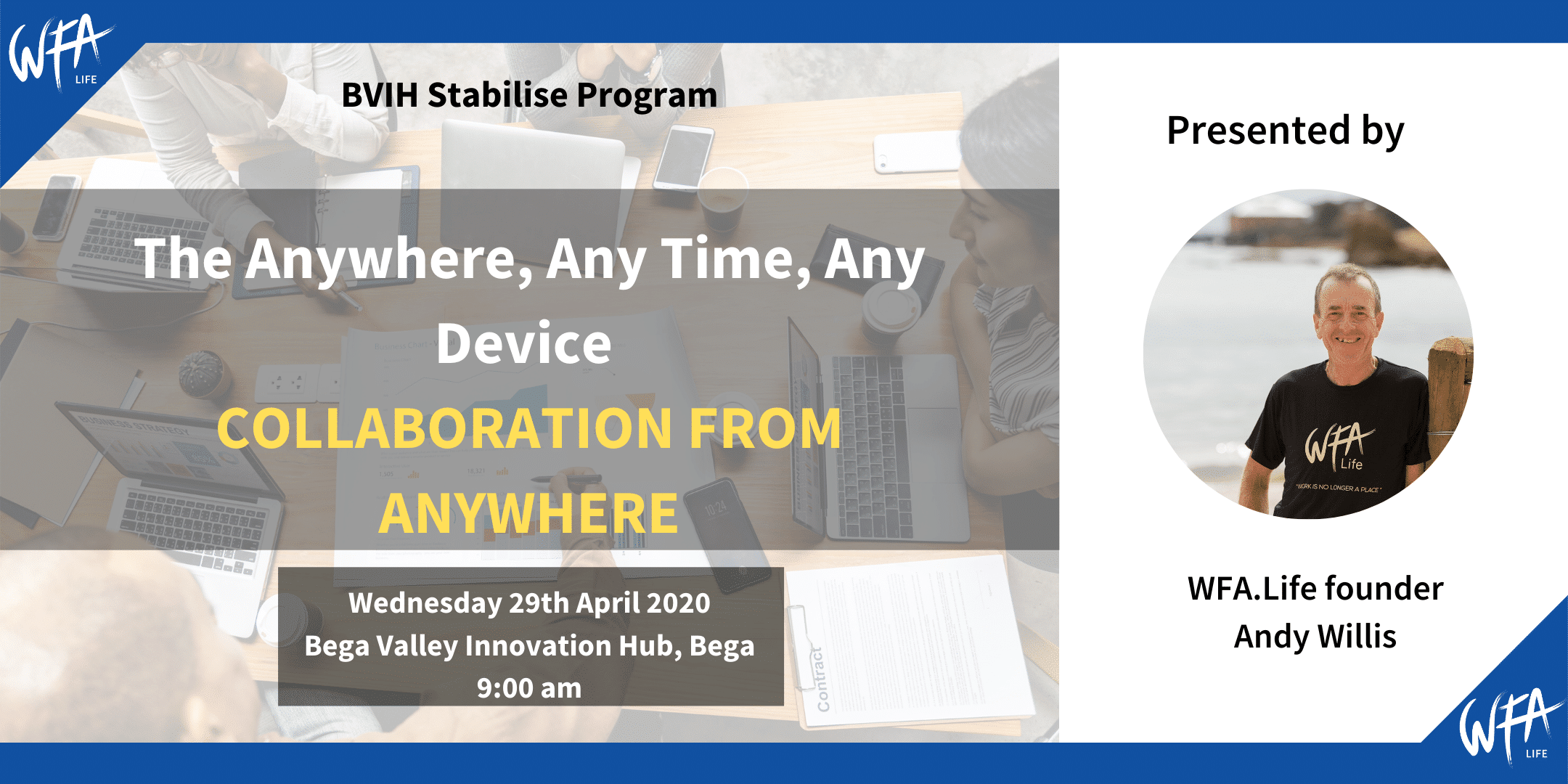 This program is a mix of presentations, workshops, hands on step step online tutorials, one on one and collaboration sessions. You will have the support of small business cloud specialist Andy Willis from Working From Anywhere throughout the program, both onsite and remotely.