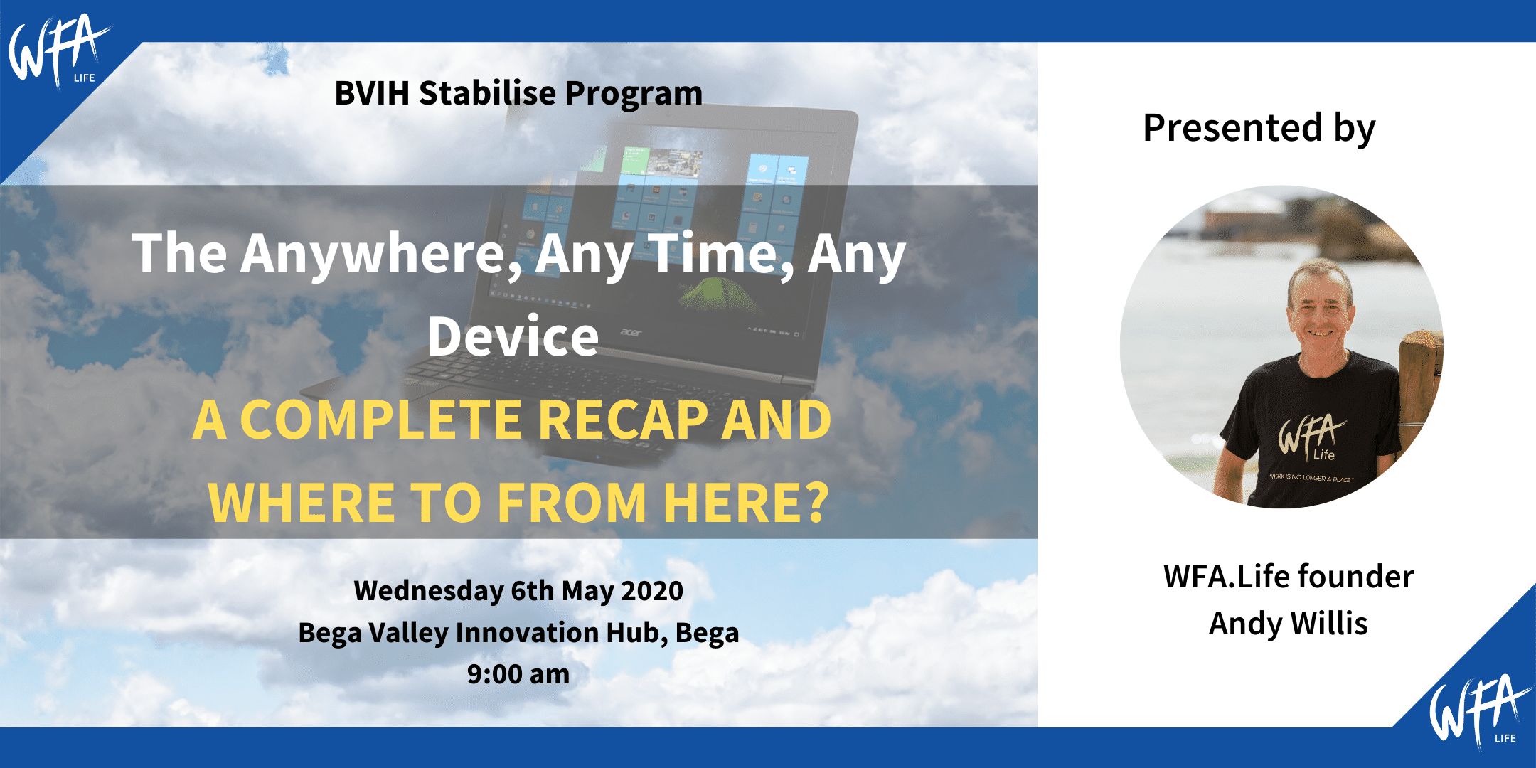 The Anywhere, Any Time, Any Device Program has been put together to guide business owners through the step by step process of securing their business against disaster as well as future-proofing their businesses and opening up opportunities to re imagine how they do business.