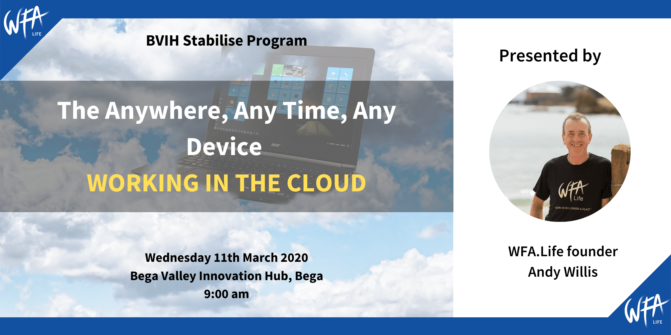 This program is a mix of presentations, workshops, hands on step step online tutorials, one on one and collaboration sessions. You will have the support of small business cloud specialist Andy Willis from Working From Anywhere throughout the program, both onsite and remotely.